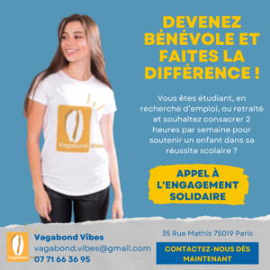 Lors de mon stage chez Vagabond Vibes, j’ai créé une affiche pour le recrutement de bénévoles. Celle-ci met en scène une jeune fille symbolisant une future bénévole, avec un t-shirt portant un mockup du logo de l’association, soulignant ainsi son identité et son message d’engagement.
